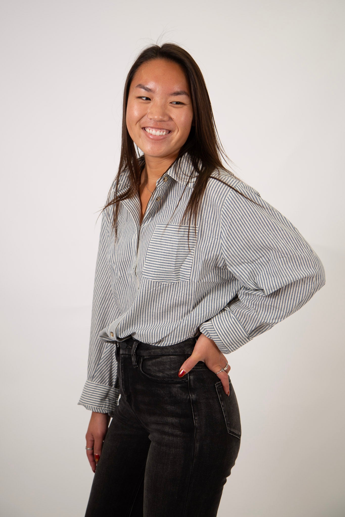 This bestselling oversized striped shirt is the definition of seasonless ease. Designed in breathable 100% cotton, it features subtle pinstripes, a relaxed dolman sleeve, and back pleats for effortless drape. The oversized fit makes it endlessly versatile. Style it tucked into denim for a casual day look, tie it at the waist for a playful twist, or layer it under cozy knits as the weather cools. From workdays to weekend outings, this shirt adapts beautifully to every occasion and pairs seamlessly with trousers, leather shorts, or skirts. A timeless piece that blends comfort with understated sophistication, it’s the ultimate go-to for layering, dressing up, or keeping it casual. Perfect for transitional styling.