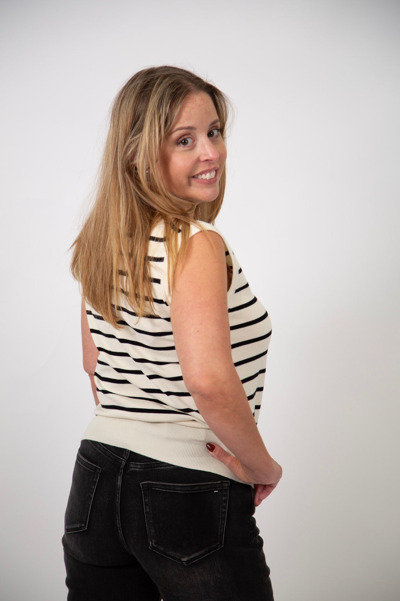 The striped muscle knit tank top with a ribbed band effortlessly combines comfort and style for a laid-back yet fashionable look. The sleeveless design allows for freedom of movement, making it an ideal choice for casual occasions or warmer days. The striped pattern adds a touch of visual interest, creating a trendy and versatile wardrobe essential. The ribbed band enhances the top's structure, providing a snug fit around the neckline and armholes. This tank top is perfect for pairing with your favorite jeans or shorts, offering a relaxed and chic ensemble that's easy to wear on various occasions. Whether you're lounging at home or heading out for a casual outing, this striped muscle knit tank top with a ribbed band is a go-to option for effortless style.