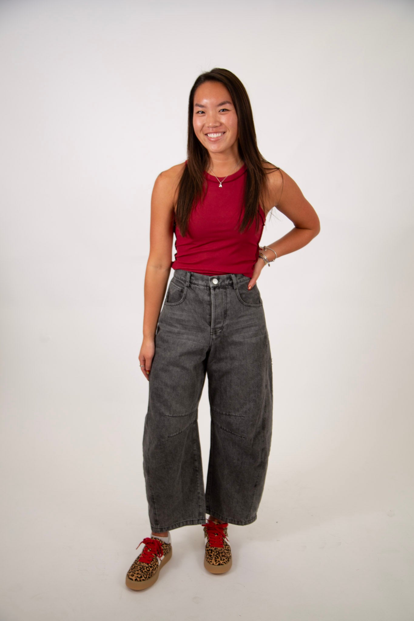 These stylish bootcut barrel jeans feature a unique etched inseam detail, combining classic denim style with a modern twist. The comfortable cotton-polyester blend offers durability and ease of wear for everyday use.
