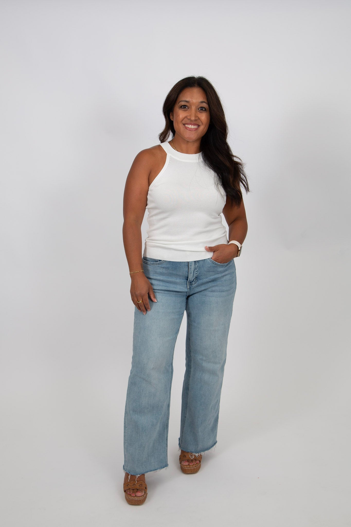 A halter neck knit tank top designed for a sleek and minimalist summer look. This top features a flattering halter neckline that accentuates the shoulders and neckline beautifully. Crafted from soft, breathable knit fabric, it offers a comfortable fit without any lining, making it perfect for layering or wearing on its own. The lightweight texture enhances its breezy appeal, while the fitted silhouette ensures a modern and stylish vibe. Ideal for pairing with high-waisted jeans, skirts, or shorts for a casual yet chic ensemble.