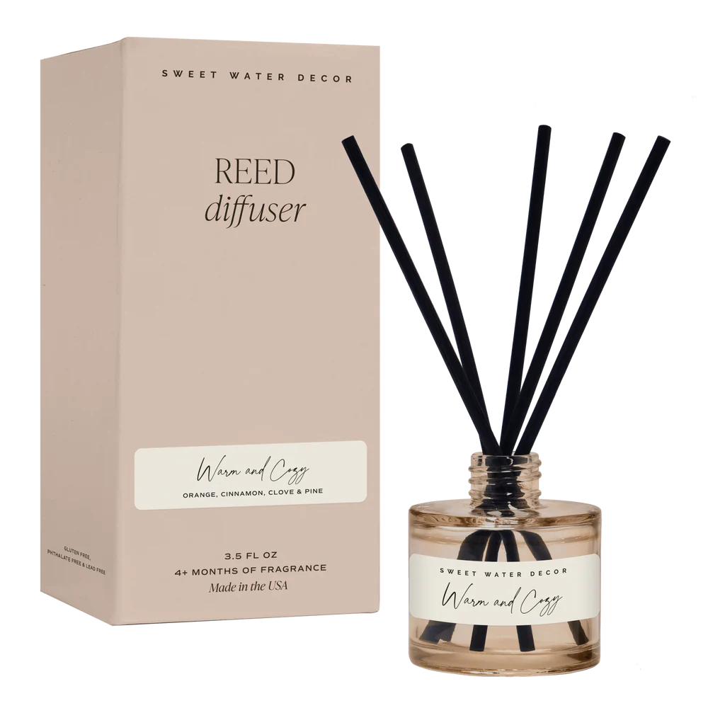 Surround yourself with the warmth of the season with our Warm and Cozy reed diffuser, designed to capture the feeling of a perfect Fall and Winter day. Notes of pine, sweet orange, cinnamon, cypress, and fir create a comforting aroma that lingers beautifully from crisp Autumn evenings into the holidays. This flameless fragrance fills your space with inviting seasonal notes, perfect for entryways, mantels, or bedside tables. Its tinted glass and timeless label complement any holiday decor, making it an effortless way to style your home or give a thoughtful gift.
